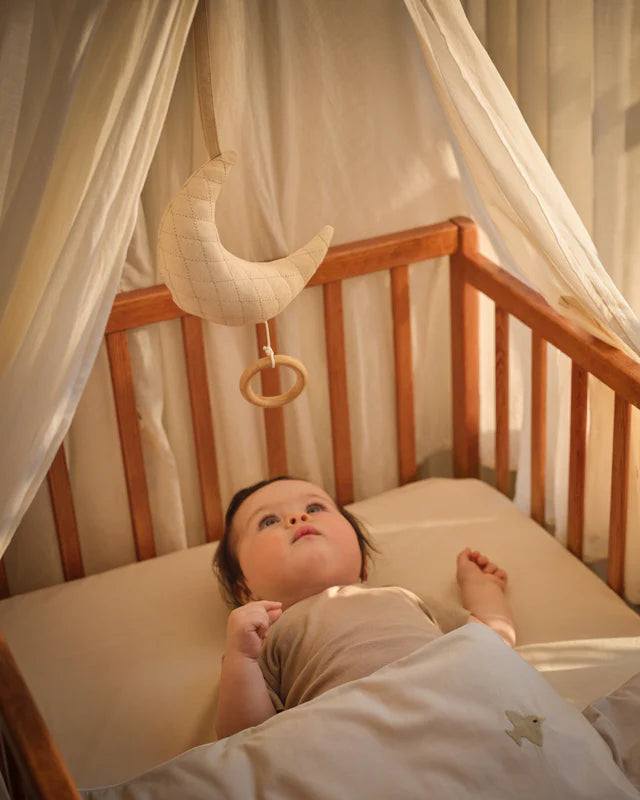 De Muziekmobiel Maan is niet alleen een mooie decoratie, maar ook een liefdevol hulpmiddel bij het slapengaan. Een prachtige aanvulling op het slaapritueel van je kleintje.