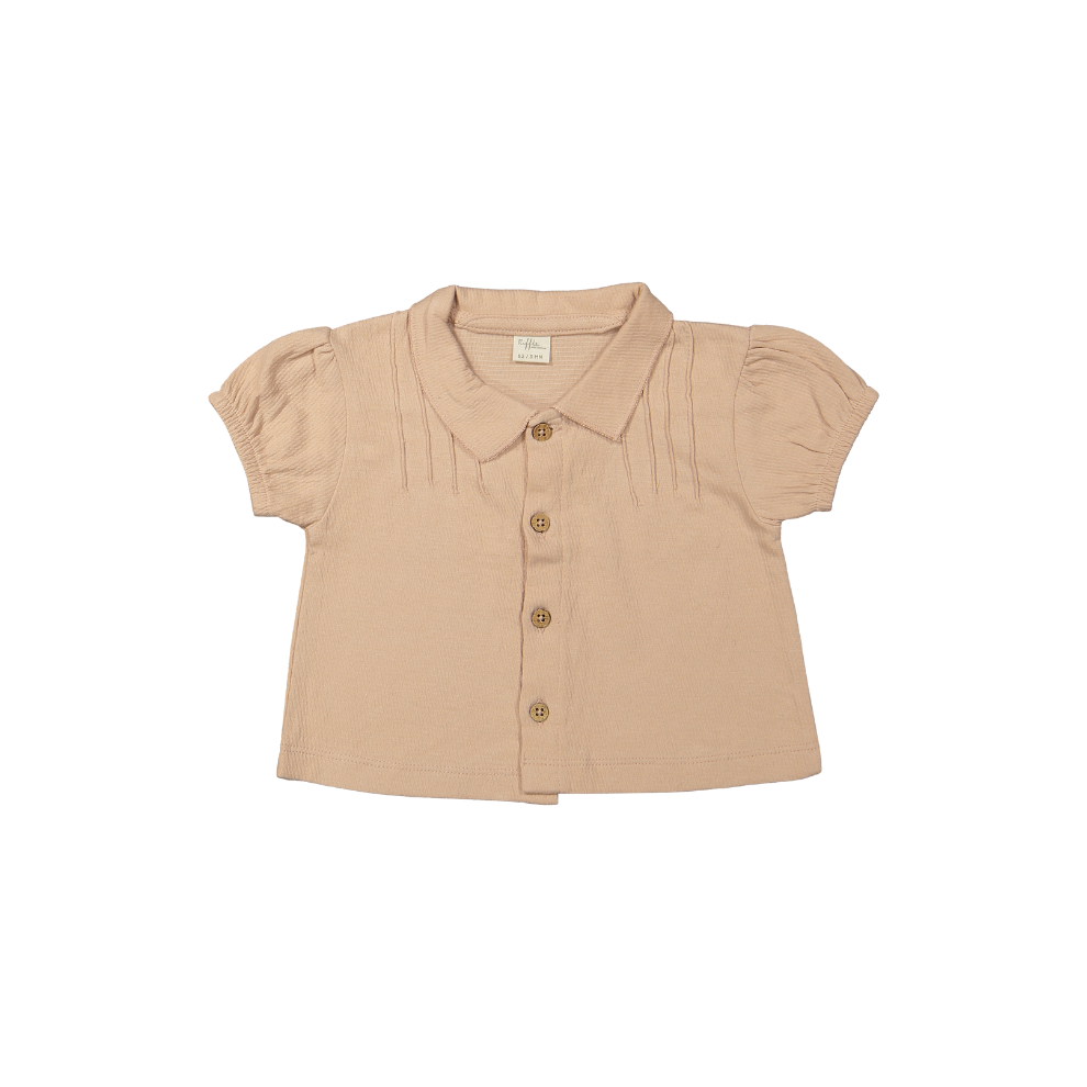 De top heeft een schattig kraagje en korte mouwen, waardoor het een speelse en stijlvolle uitstraling krijgt. De lichtroze kleur is gemakkelijk te combineren met broekjes, rokjes of shorts uit de Riffle Amsterdam collectie voor een complete look.