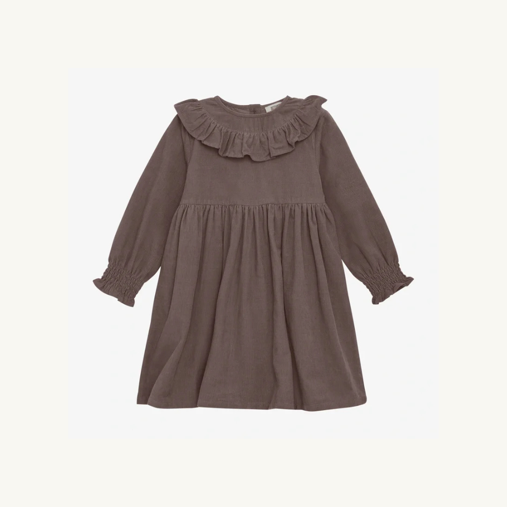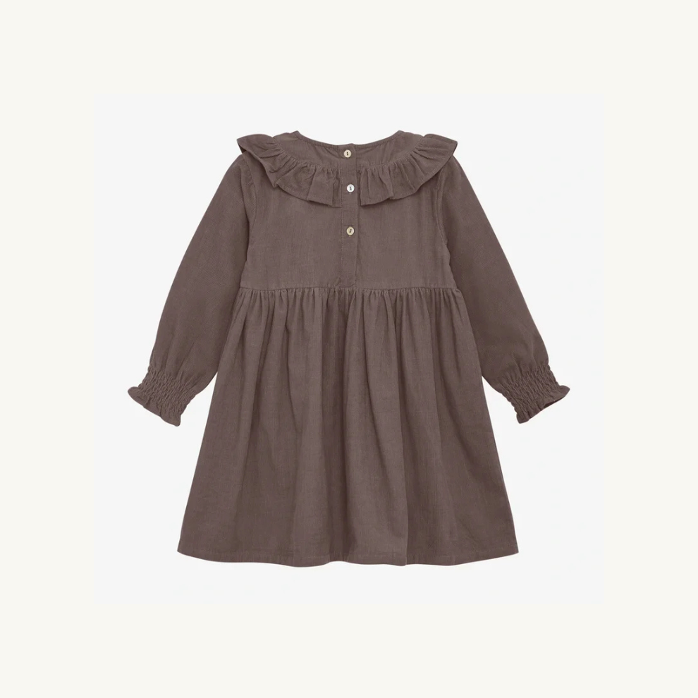 Een tijdloze corduroy jurk van Huttelihut, gemaakt van 100% biologisch katoen in een warme bruintint. De jurk heeft een comfortabele pasvorm, lange mouwen en sluit met houten knoopjes aan de voorzijde.
