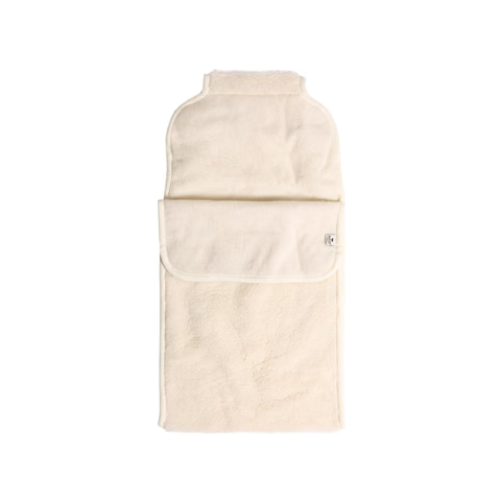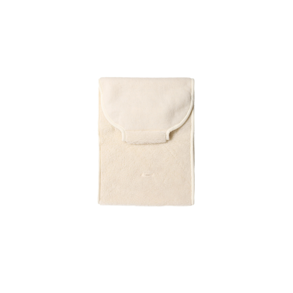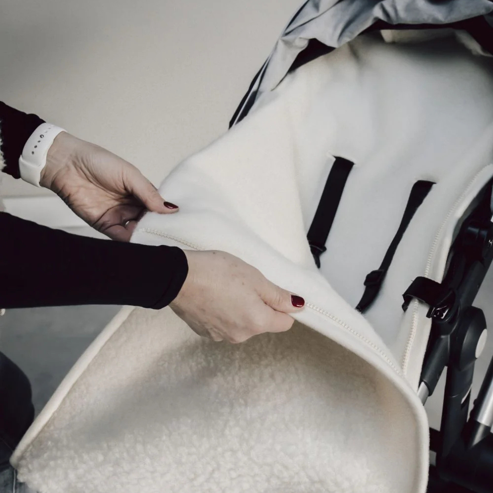 De voetenzak is praktisch in gebruik dankzij de twee ritsen aan beide zijkanten en de vier openingen, waardoor de riempjes van de wandelwagen of buggy eenvoudig doorgevoerd kunnen worden. Aan de bovenzijde is een extra strook wol aangebracht die je kunt omslaan naar de achterkant. Hierdoor blijft de voetenzak goed op zijn plek, ook tijdens beweging.
